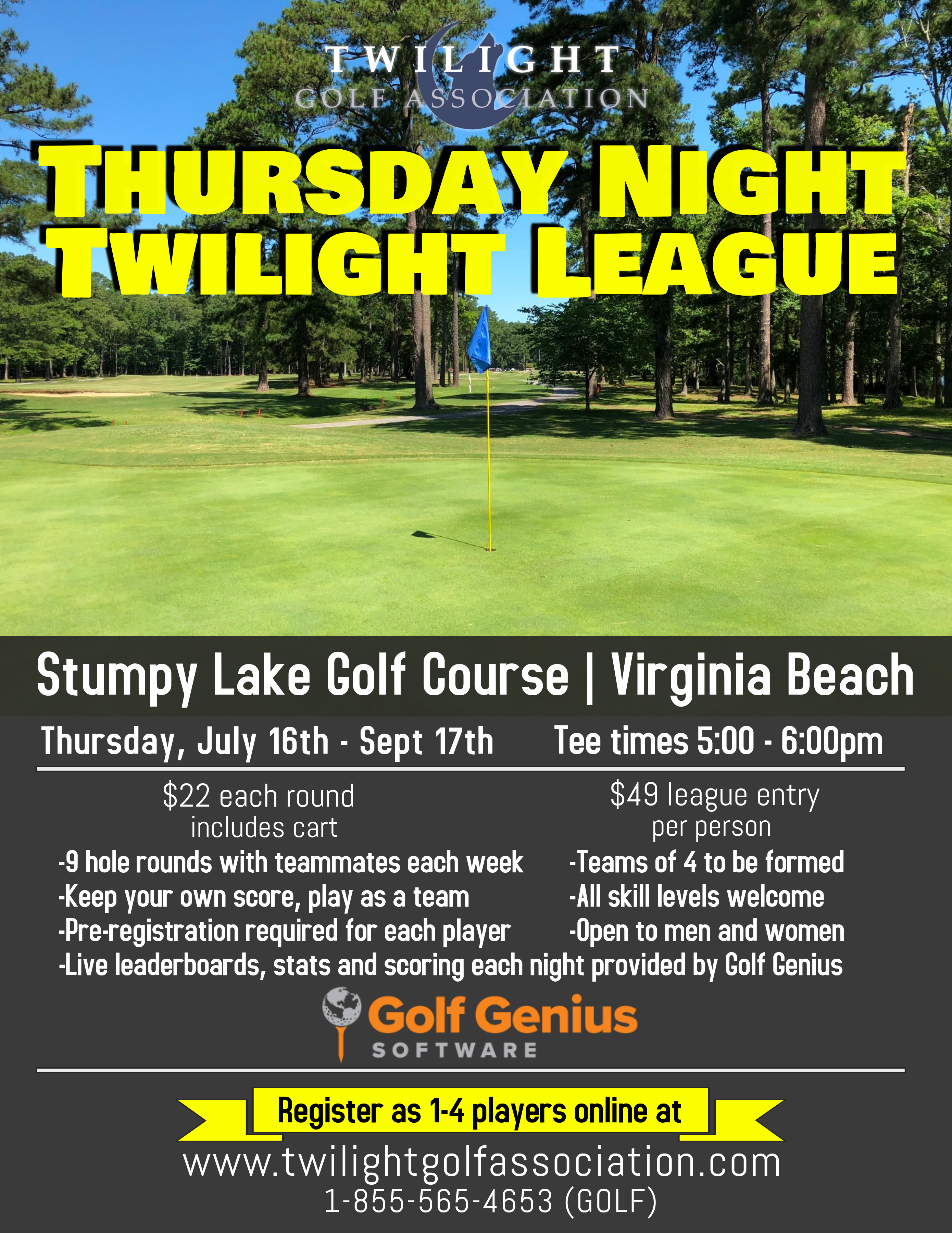 For more information, e-mail play@twilightgolfassociation.com or call 1-855-565-4653 (GOLF).